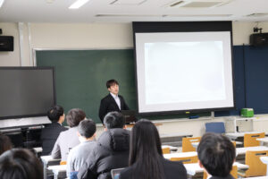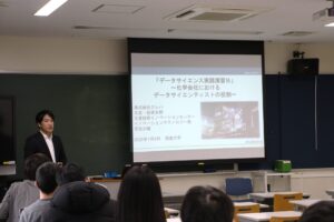 当日は、株式会社日本総合研究所の百瀬 耕平様、半澤 智希様、ならびに株式会社クレハの宮田 大輔様にお越しいただき、「データサイエンティストとは」をテーマに、実際の仕事内容やキャリア形成についてお話しいただきました。実務経験に基づく具体的なお話に、学生たちは真剣に耳を傾け、本分野への理解を一層深める貴重な機会となりました。