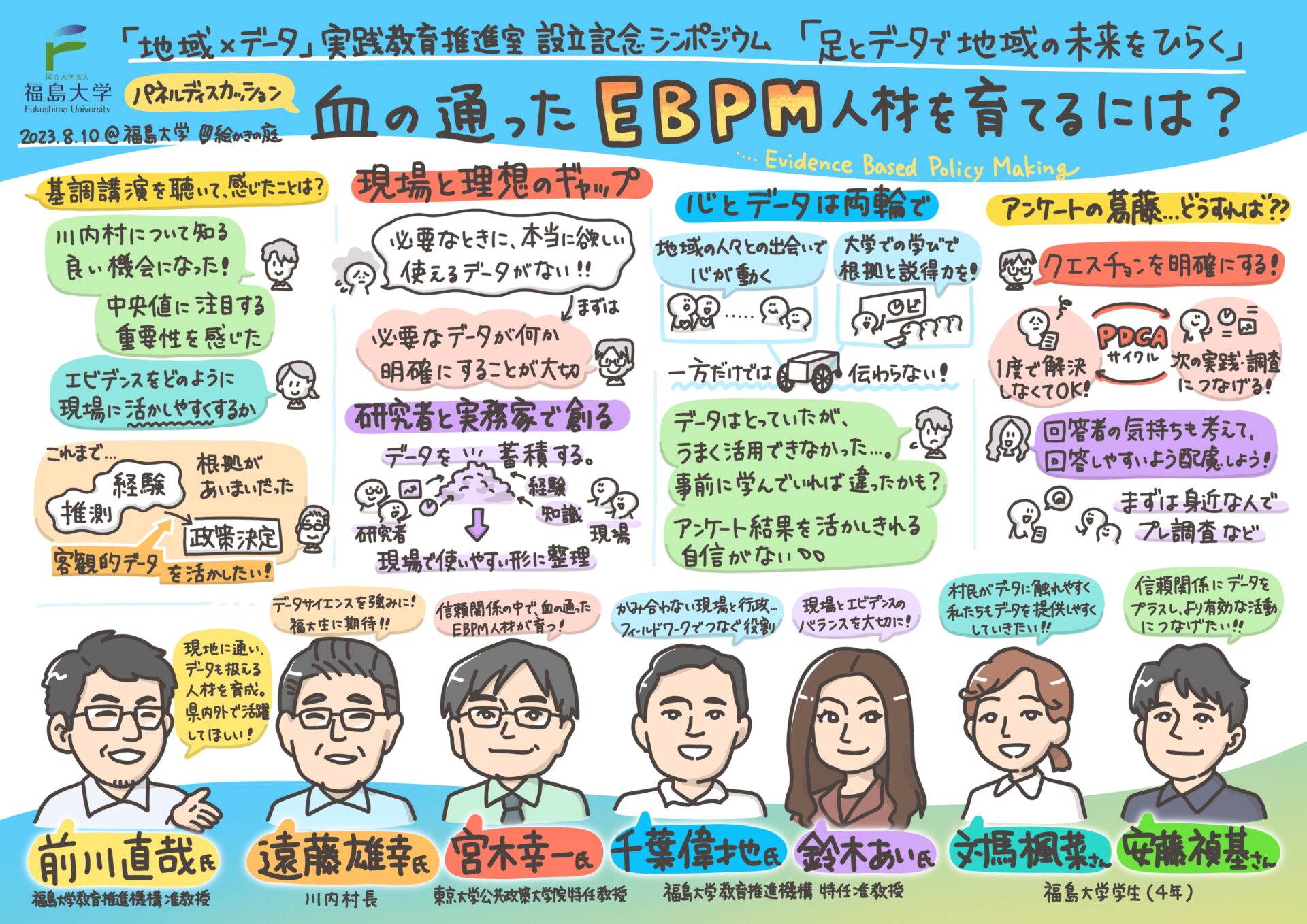 シンポジウム後半では、ご講演いただいた遠藤雄幸村長、宮木幸一特任教授に「地域×データ」実践教育推進室の教員と学生を、交えたパネルディスカッションを行い、地域での活動で得たデータの活かし方やデータの重要性について意見を交わしました。