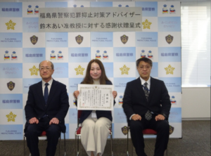 鈴木あい特任准教授が福島県警察より感謝状をいただきました。